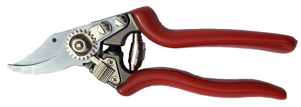 Forged 1 3/4" (45mm) high carbon sword steel blade has a 2-position lock that diminishes hand fatigue when performing multiple small cuts and has a self oiling center bolt built in.